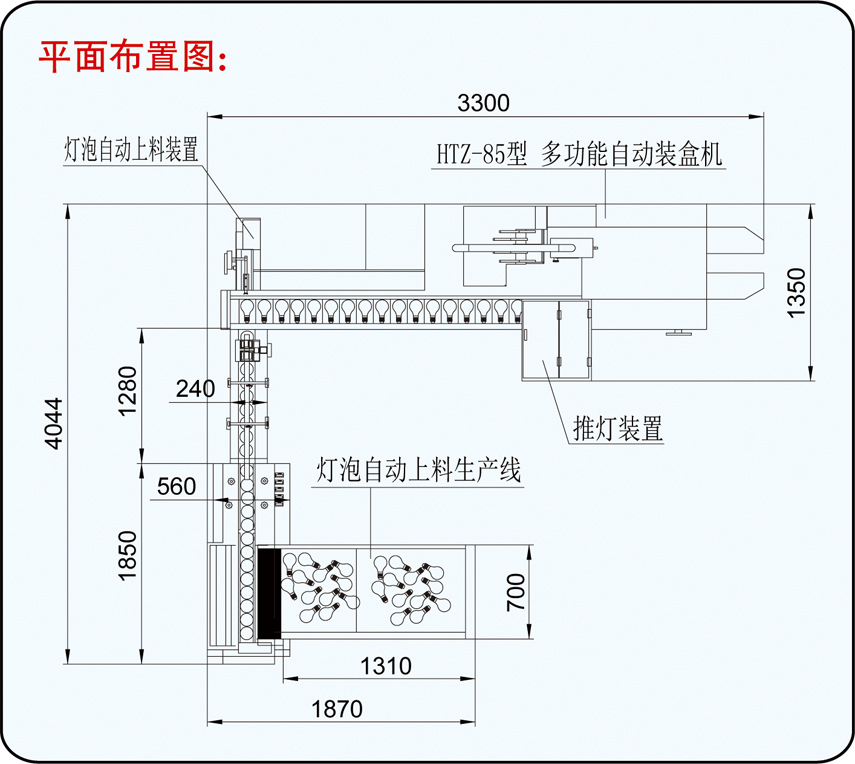 The production linkage line adopts a combination of multiple conveyor belts and a combination of light, electricity, machine and gas to complete the automatic feeding of various specifications of the bulbs onto the conveyor belt of the packaging machine; The PLC computer and integrated control system are used for synchronous production to form an automatic production linkage line.